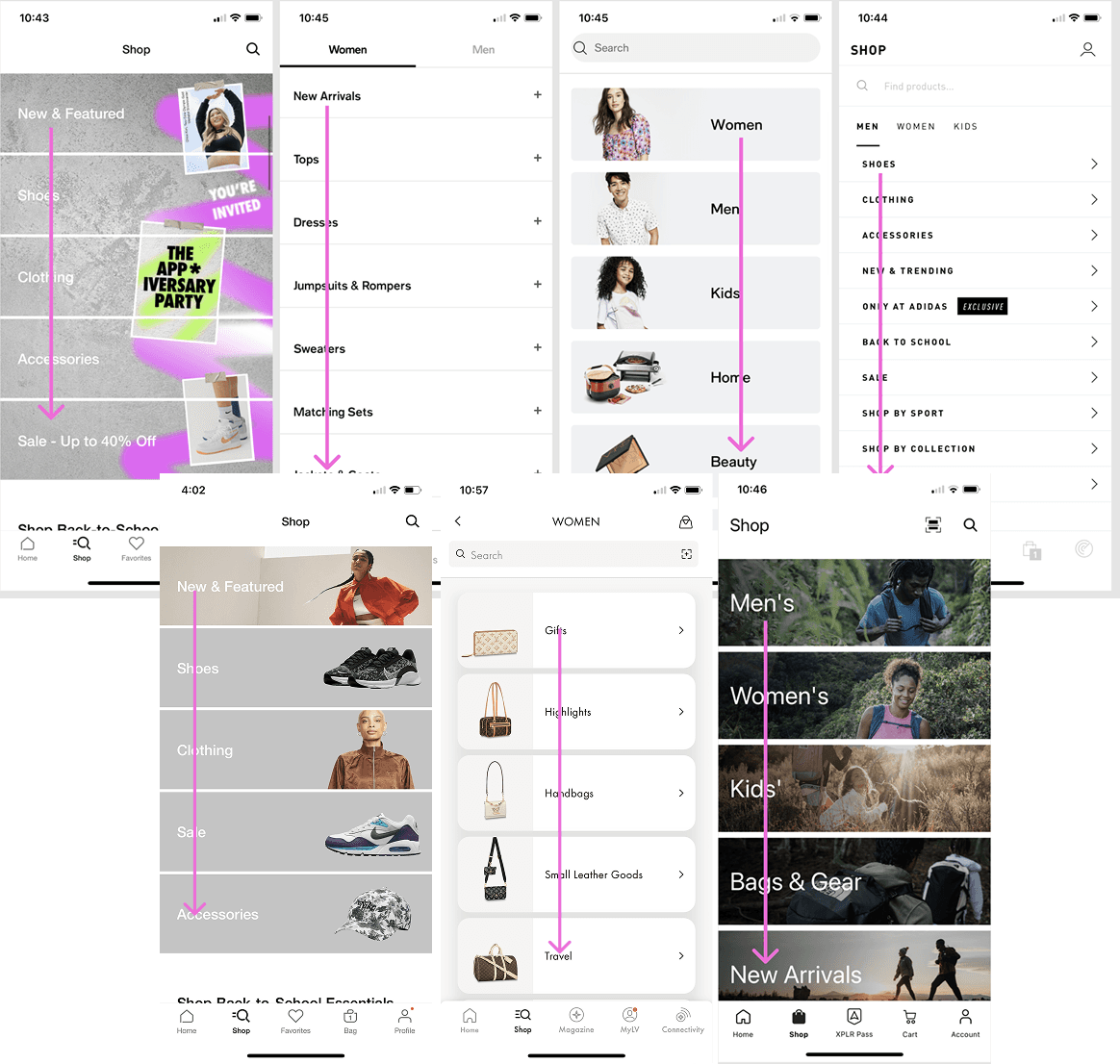 Competitive analysis showed search and browse surfaces typically favor vertical, scannable category structures over larger promotional image blocks.