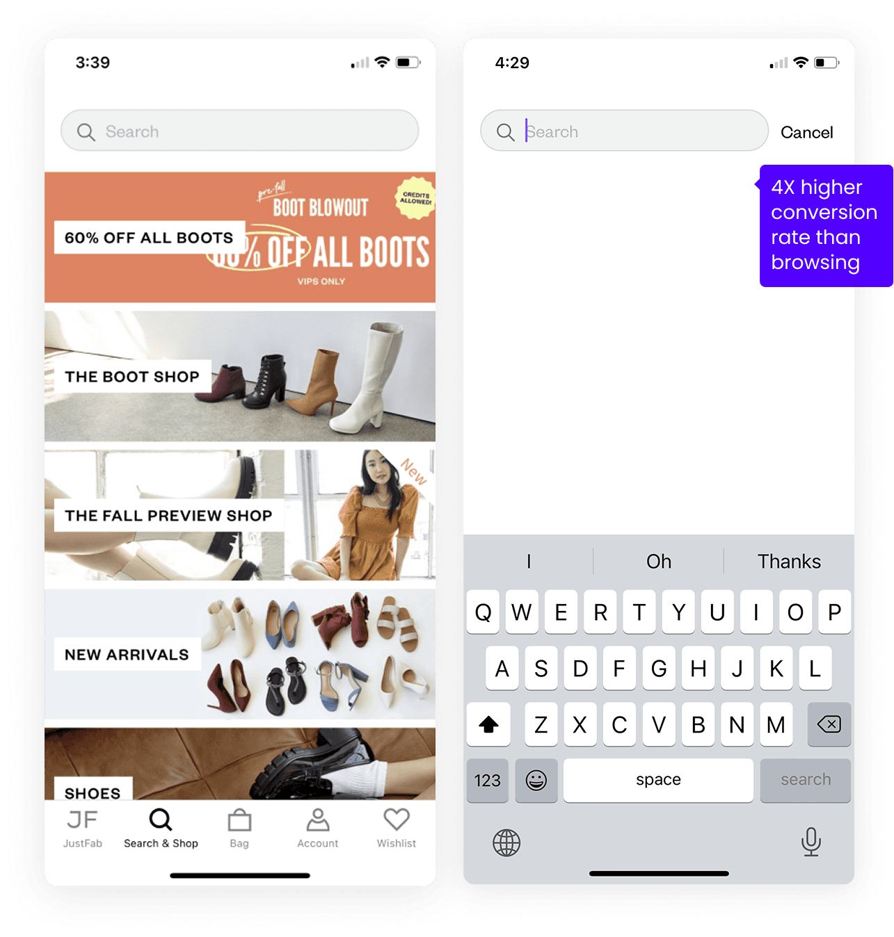 Keyword searchers were far more conversion driven, with search users converting 4x higher than scrollers, which pointed to the need for smart suggestions, recent searches, auto correction, and fuzzy matching to speed users to relevant results.
