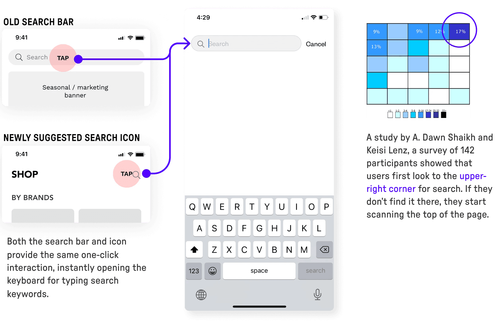 Research showed users naturally scan the upper right area for search, and it supported the shift from a persistent search bar to a search icon without hurting discoverability.