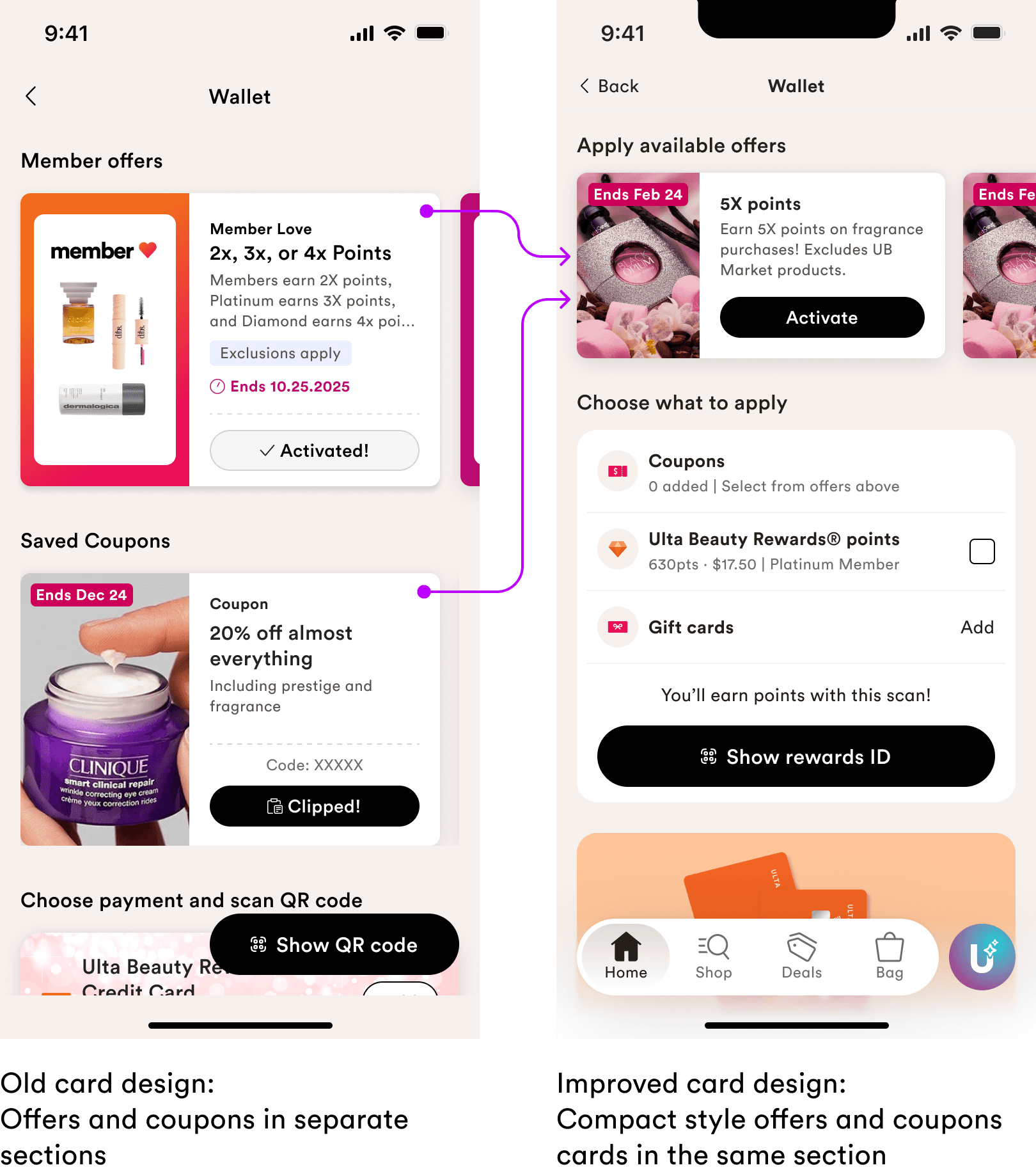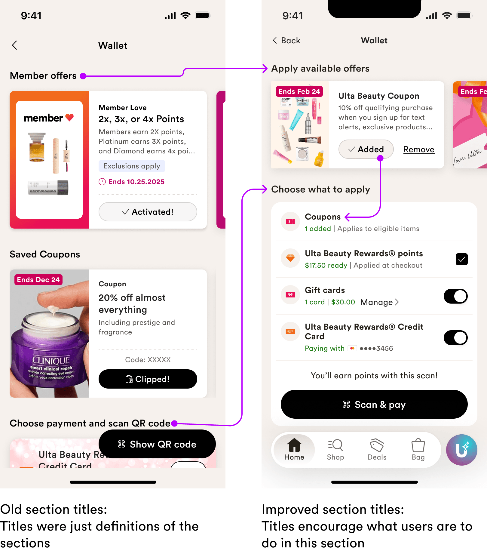 I updated labels like "Member offers" and "Saved coupons" to start with verbs and nudged users on what they can do in each section and made the interface more actionable.Linked discounts to the payment flow