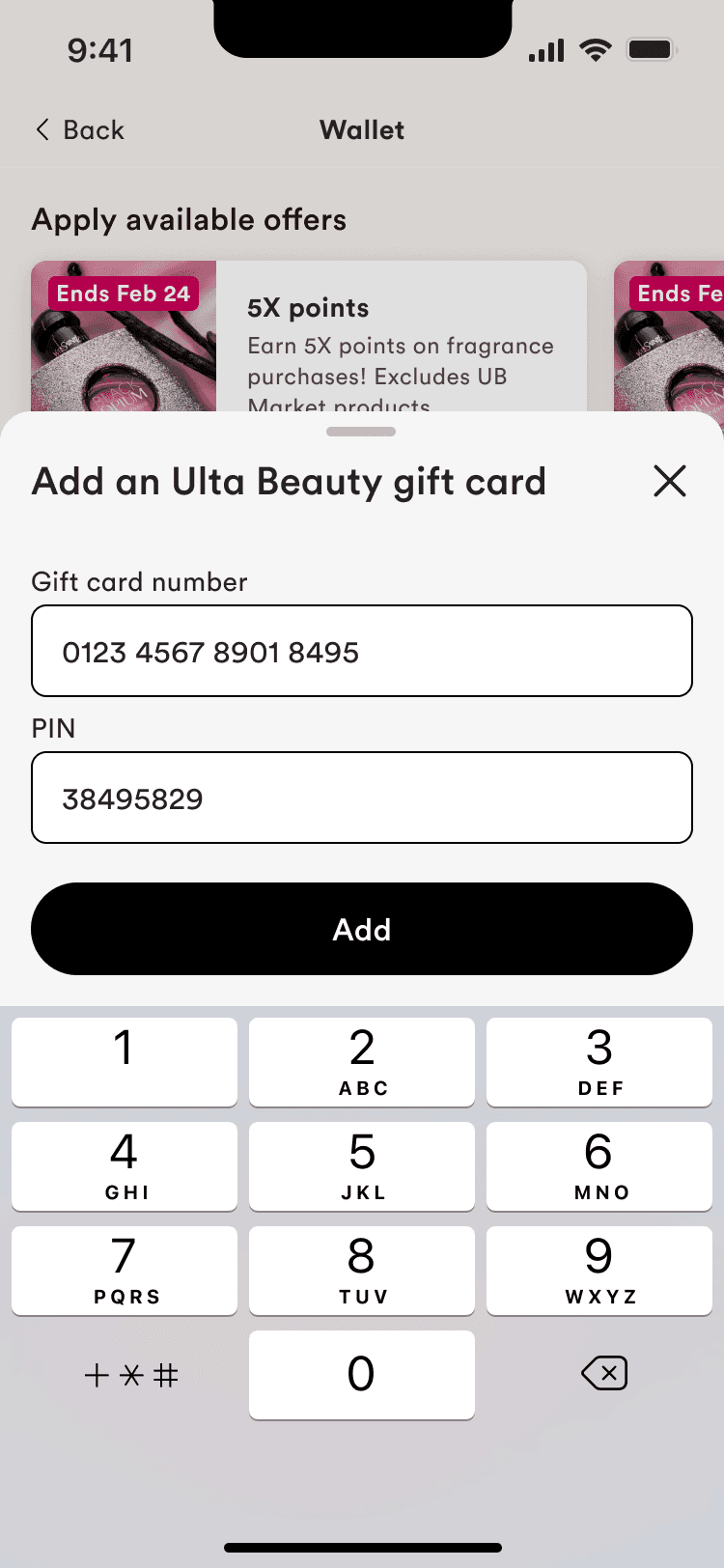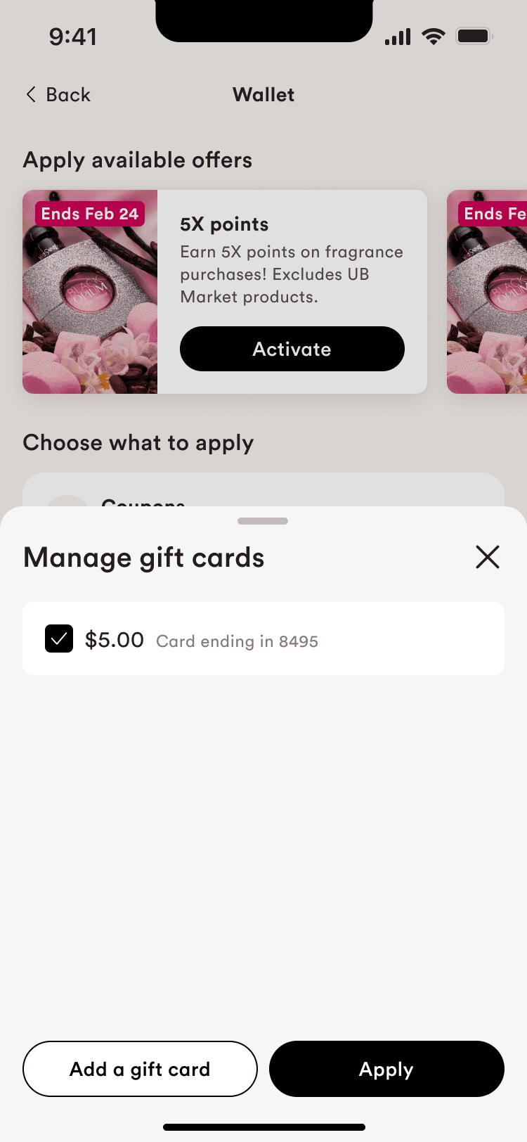 Moved actions such as adding or managing credit and gift cards into bottom sheets to keep the primary screen uncluttered.