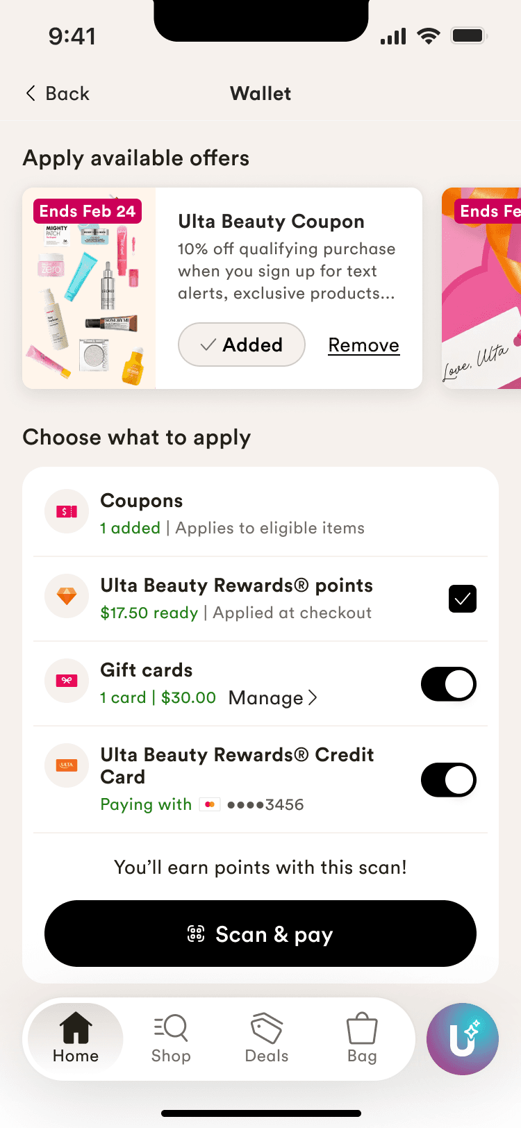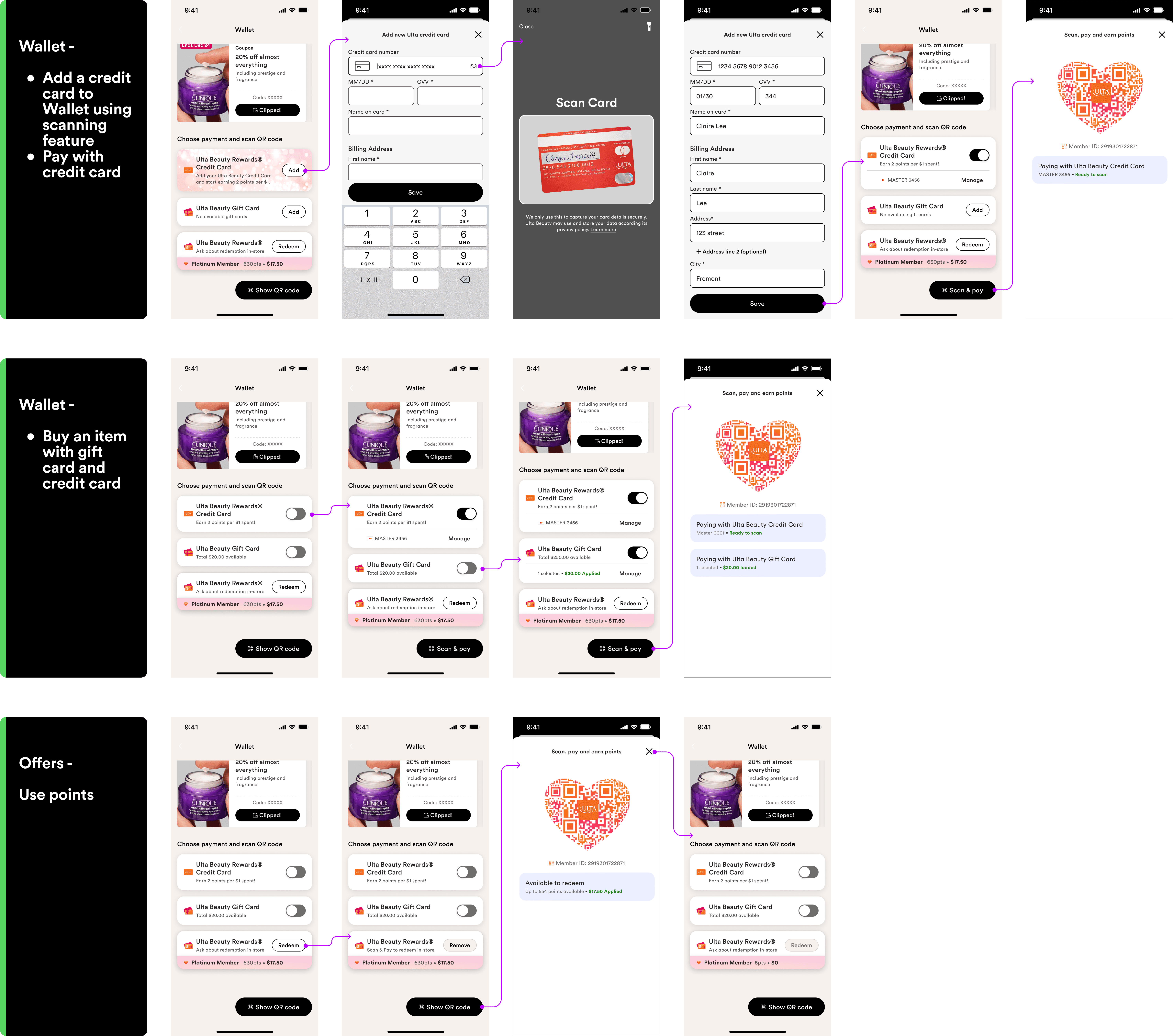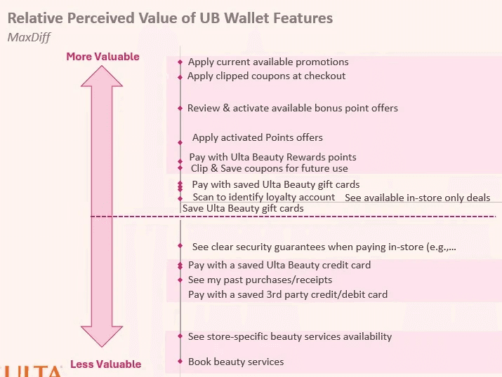 Research showed that shoppers associate the Ulta wallet primarily with rewards, coupons, and bonus point offers, rather than payment convenience. The perceived value comes from helping customers maximize benefits tied to the loyalty program.
